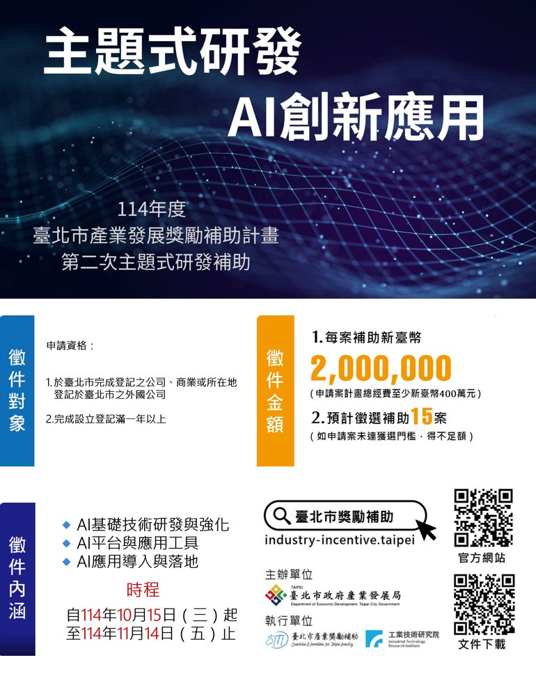 🔥歡迎設立於臺北市滿一年以上之企業踴躍申請,開創AI產業新契機!